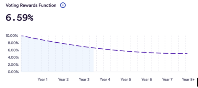 在了解其代币构成前,我们必须要先了解其基于神经元的治理机制。在 ICP 的链上治理 DAO 组织 Network Nervous System(NNS)中,任何人都能通过质押 ICP 生成一个神经元(neuron),来发起治理提案或参与治理。如果说 ICP 是一台巨型的分布式计算机网络,各个数据中心和节点提供了运行的硬件设施,那么 NNS 就是这台计算机的管理员,通过提案方式,决定了 ICP 这台超级计算机网络的运行机制和生态中的利益分配等相关事宜。神经元持有者根据锁定的 ICP 代币的数量以及锁定期长度(最长 8 年)按比例获得奖励,如果提案通过,神经元就能积累“成熟度”(Maturity),当其达到一个门槛后,就可以“生产“出新的神经元(新神经元中锁定 ICP 数量 = 老神经元 ICP 数量 * 成熟度)。该神经元奖励的方式主要来自于 ICP 增发,第一年的增发为总量的 10%,随着时间的推移,增发曲线呈二次方下降,直到 8 年后下降到并保持在 5%,目前增发比例为 6.59%。用户可以选择将新神经元合并(Merge),类似于将新神经元利息复投,或支出(Disburse),将利息进行提现,即将新神经元铸造成 ICP。