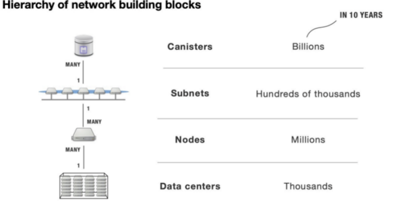 ICP 采用了分层的架构,主要包括容器(Canister)、子网(Subnet)、节点(Node)和数据中心(如 CPU、网络和内存资源)。