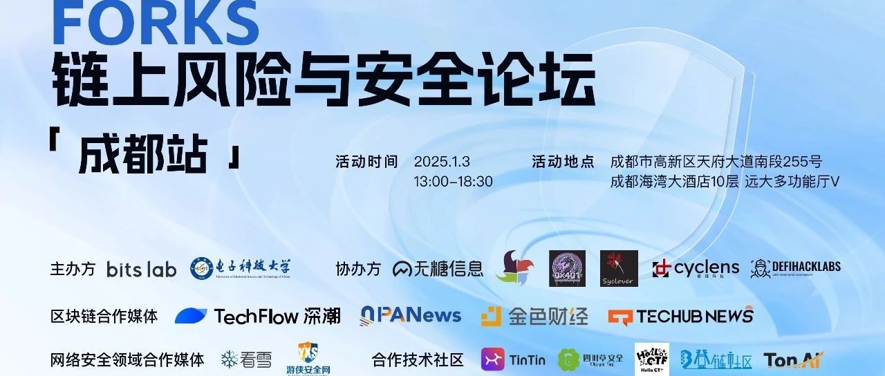 FORKS 链上风险与安全论坛「成都站」活动倒计时仅剩 3 天!洞悉区块链与传统网络安全领域的前沿技术,结识业界大咖并拓展人脉,这将是你不容错过的一次线下盛会!