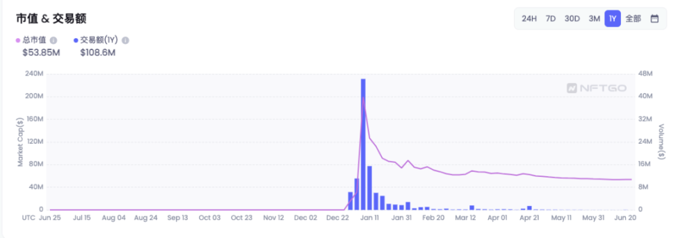 根据NFTGO 6月24日的数据,NFT市场总市值已由今年2月366亿美元的高点跌至226亿美元,跌幅超过38%。NFT单日交易额由33.94亿美元的高点跌至1.5亿美元左右,下降了95.5%。