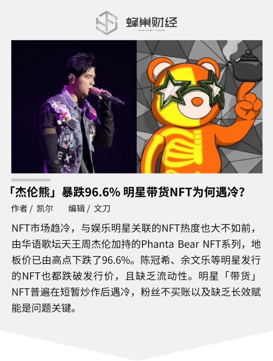 从外界反馈来看,许多明星粉丝更期待有艺术审美和联动玩法的NFT项目。在陈冠希发售「外星人形象」的NFT后,一些用户直言这组NFT太过惊悚,无法欣赏其中的艺术品味。另有资深周杰伦粉丝告诉蜂巢Tech,希望明星背书的NFT能与演唱会或明星本人进行联动,「比如我买了『杰伦熊』NFT,就可以凭此去看一场周杰伦的演唱会,或者能和他近距离接触,这样才觉得买入的NFT有价值。」