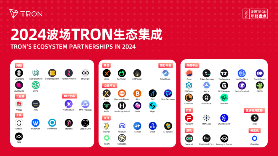 2024 年,波场 TRON 持续扩展生态边界,集成 50 余个平台及应用,涉及跨链、支付、云服务、交易等领域,积极推动区块链技术在实际应用中的覆盖与影响力。2024 年,波场 TRON 通过多维度的合作与集成,显著增强了网络的可访问性,加速触达更广泛的用户群体。LayerZero、Allbridge Core、Butter Network 等多个跨链解决方案的支持,增强了波场 TRON 与其他公链的互操作性,提供了更加便捷的跨链体验。同时,与亚马逊云计算服务(AWS)和华为云等全球领先云服务提供商的联动,显著提升了波场网络的普及度、可靠性及可扩展性。而与比特币二层解决方案 Merlin Chain 的战略合作,则推动了波场 TRON 的多链融合发展,为未来带来了更大的想象空间。2024 年,波场 TRON 在应用集成方面也取得了显著进展,进一步推动了区块链技术更广泛地融入日常生活。UXUY、FoxWallet 等多款钱包的集成,为用户提供了安全便捷的资产管理工具。Bitget、HashKey Global 等主流交易平台的支持,进一步扩大了波场 TRON 的市场影响力。此外,Cypher、Mobilum 等支付服务的合作,以及 Travel Care 等旅行平台的支持,使得波场网络在全球支付和消费场景中的应用日益广泛。2024 年,波场 TRON 不断完善基础设施建设,全面赋能行业未来。Dune、TradingView 等多个顶级数据分析平台都相继集成波场网络,使波场生态为用户提供了更加丰富和动态的数据探索与分析环境。与 FearsOff 的合作则彰显了波场 TRON 对于提升透明度、持续优化基础设施及确保网络安全的不懈追求。同时,波场 TRON 还加入 Chainlink Scale 计划,旨在为开发者和用户提供更优质的服务和产品,进而打造一个更加繁荣的生态系统。肩负建设元宇宙金融自由港的使命,未来波场 TRON 将与更多行业内外领先团队合作,持续拓展应用场景,打造更加稳固的生态体系,为推动区块链技术的大规模普及贡献更多力量。「孙哥说」已开通视频号,不定期分享有关孙宇晨的短视频,欢迎关注和转发!
