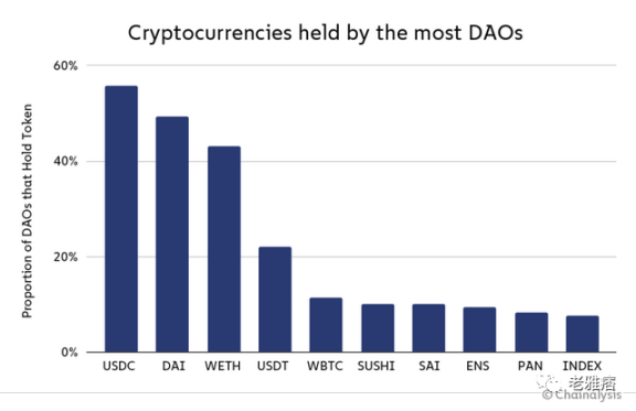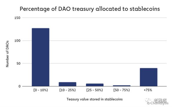 然而,稳定币很少占到链上大部分财物价值。平均而言,85%的DAO的链上财物存储在单一资产中,而在我们研究的DAO中,该资产只有23%是稳定币。