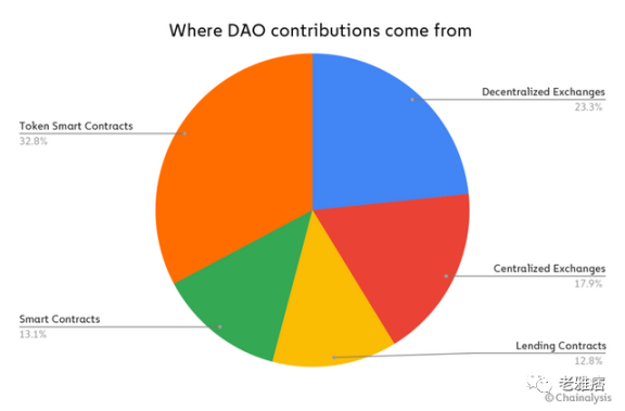 但就原始数字和库房规模而言,与DeFi相关的DAO有巨大的领先优势。DeFi类别占所有DAO持有的库房价值的83%,按数量计算占所有DAO的33%。