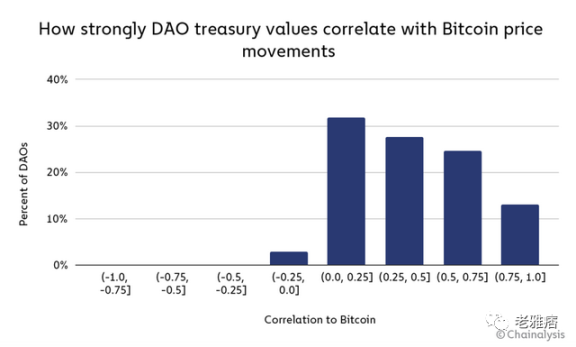 DAO库房价值也与比特币价格走势相当相关。38%的链上DAO国债与比特币的关联度在0.5和1.00之间。