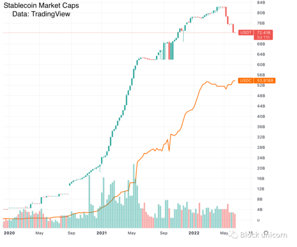 随着加密货币价格的下跌,稳定币两种用途的有效需求都减少了。