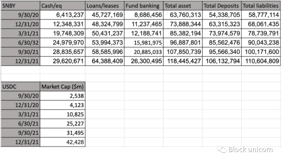 因为 SI 和 SBNY 是上市公司,我们可以在他们各自的 SEC 备案文件 (SI, SBNY) 中跟踪他们每个季度的资产负债表。500 亿美元是一大笔钱,即使对银行来说也是一大笔钱,因此我们可以跟踪 USDC 增长带来的资产负债表变化。将 USDC 与资产负债表相关联,我们看到,在 2021 年的增长期间,USDC 大部分在 SBNY 银行: