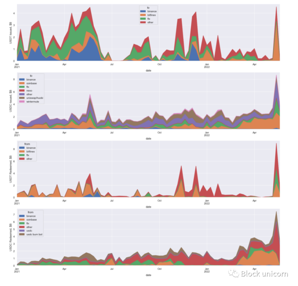请注意,在 2022 年 5 月,在 LUNA 稳定币崩盘时,大约 10B 美元的 USDT 被赎回。其中,大约 5B 美元是「USDT 去风险」,做市商将 USDT 换成 USDC。