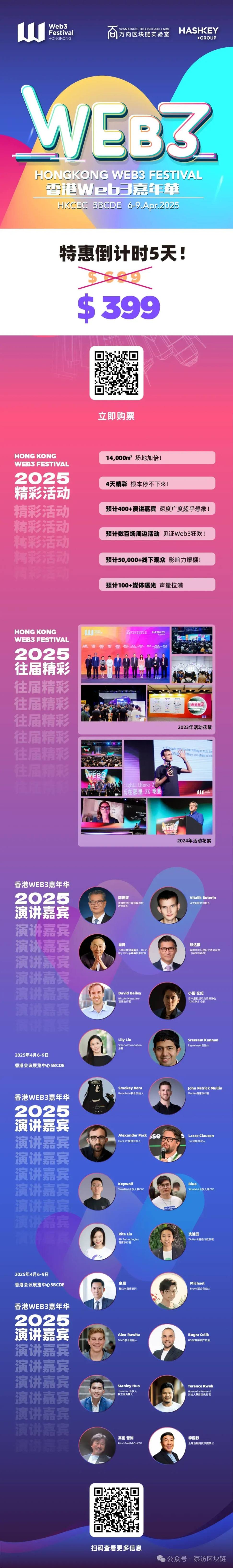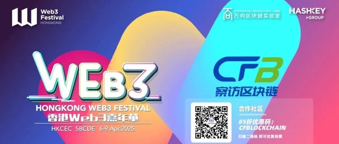 由万向区块链实验室携手 HashKey Group 倾力打造的年度盛会——2025 香港 Web3 嘉年华将于 2025 年 4 月 6 日至 9 日,在香港会议展览中心 5BCDE 展厅震撼启幕,一场科技与创新的全球盛宴正等待着每一位 Web3 爱好者的加入。现在购票即可享 1 月票特惠,立省 300$!赶快点击链接购买:https://lu.ma/hkweb3festival_2025?coupon=CFBLOCKCHAIN,(使用察访区块链优惠码( CFBLOCKCHAIN )即可享受85 折专属优惠价格。