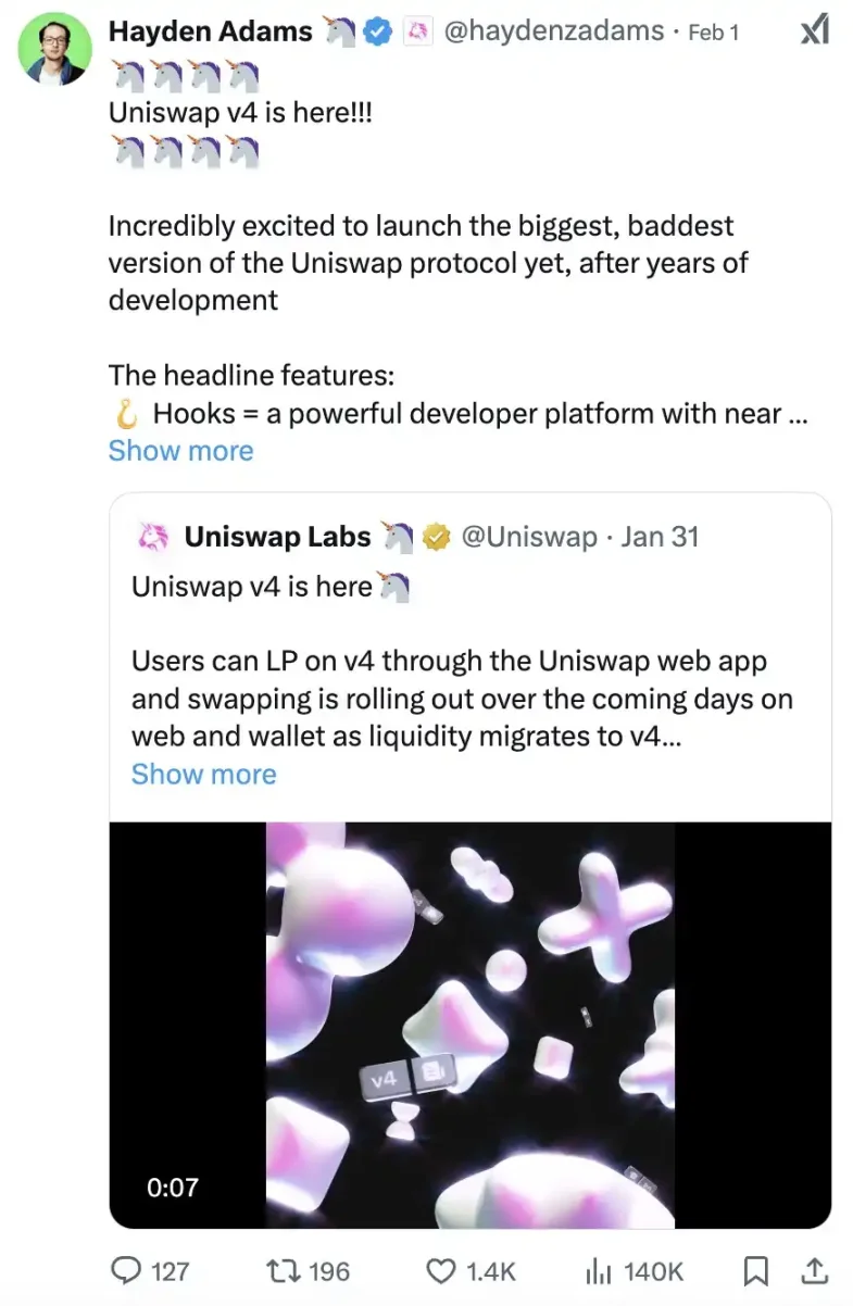 Uniswap V4 预计将在 DeFi 中注入新一波活力,为以太坊生态系统带来许多新的用例。这只是开始,随着 Uniswap V4 的上线,未来几周我们可以继续期待更多创新的 Hooks。