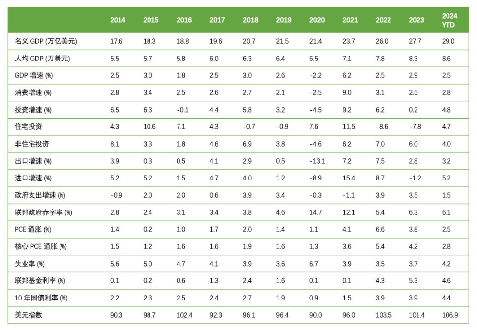 2024 年,美国经济增长 2.7%,主要由家庭消费、企业投资、政府支出和出口推动。家庭消费因就业市场稳健、工资增长和低利率支撑,预计全年增速 2.6%,对 GDP 贡献 1.7 个百分点。企业投资受盈利强劲、AI 技术革命和财政补贴支持,预计全年增速 3.7%。政府支出因高财政赤字,预计增速 3.5%。出口因海外需求和供应链改善,预计增速 3.4%。
