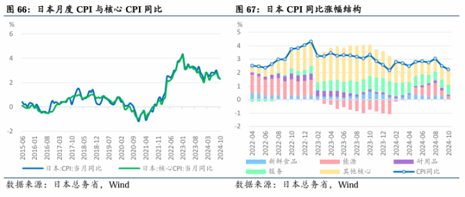 通胀方面,日本逐步摆脱通缩,1-10 月整体 CPI 及剔除生鲜食品的核心 CPI 均超过 2%。最高点 8 月的 CPI 和核心 CPI 分别同比上涨 3% 和 2.8%,10 月日本 CPI 和核心 CPI 同比上涨 2.3% 和 2.2%。诸多因素共同推动日本逐步摆脱通缩,包括工资增长,本年度春季劳资谈判工资涨幅为 5.1%(基本工资涨幅为 3.56%),截至 10 月,劳动者的基本工资同比增长 2.7%;价格转嫁上涨,企业价格自 2022 年至 2023 年大幅增长,2024 年虽增幅缩小但仍持续上涨,服务价格自 2023 年以后也随着工资上涨加速而明显提高;物价预期上涨,日本银行 12 月调查的企业物价预期中,“物价总体预期”在 1 年后同比增长 2.4%、3 年后增长 2.3%、5 年后增长 2.2%,呈现稳定上涨态势。