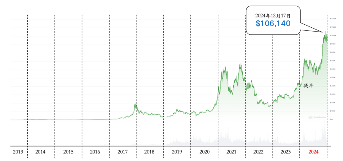 比特币(BTC)价格从年初的约 4 万美元上涨至 12 月的超过 10 万美元,涨幅超过 150%。比特币 ETF 的推出和机构投资者的大量买入是推动其价格上涨的主要因素。许多其他加密货币也表现出色,例如,本轮周期中 Memecoin 和 AI+Crypto 等市场表现突出。