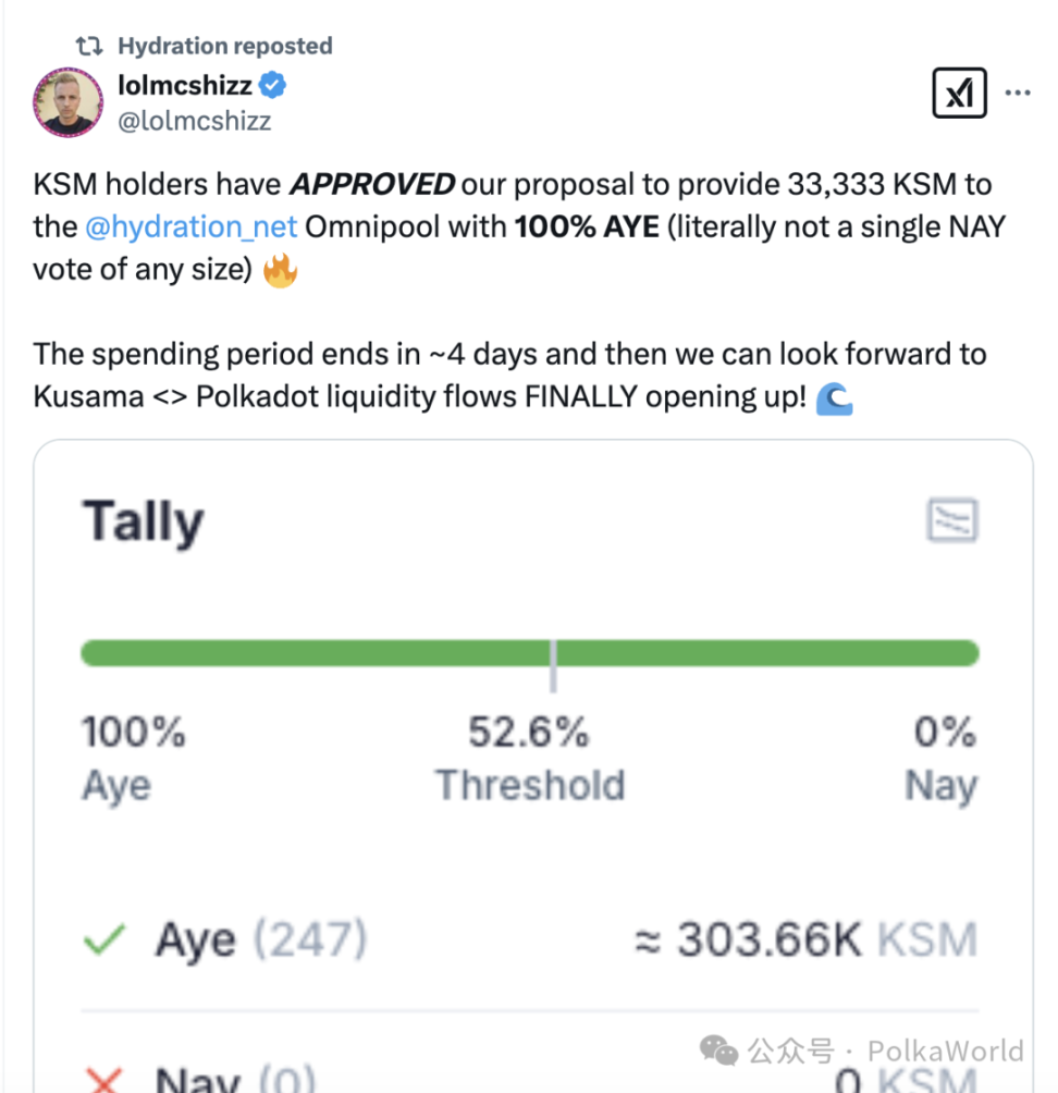 Hydration 申请 33,333 KSM 的提案通过!申请的 KSM 将提供给 Hydration Omnipool 来增强 Kusama 链上的流动性,从而促进 Kusama 和 Polkadot 之间的价值流动。这将为这两条链之间提供一个简单且去中心化的流动性连接,避免了使用集中式交易所(CEX)作为中介。