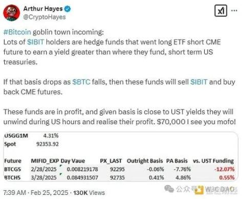 BitMEX 联合创始人 Arthur Hayes 在社交媒体发文表示,许多 IBIT 持有者是对冲基金,他们通过做多 ETF、做空 CME 期货来赚取高于短期美国国债的收益。如果 BTC 价格下跌导致基差(即 ETF 价格与期货价格的差距)缩小,那么这些基金将会卖出 IBIT,并回补 CME 期货。这些基金目前是盈利的,考虑到基差接近美国国债收益率,它们将在美国交易时段进行平仓,兑现利润。我看跌至 70,000 美元。