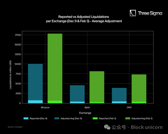 Bybit 和 OKX 遵循相同的模式:Bybit 的调整后清算在 2 月 3 日估计为 8.15 亿,而不是报告的 2.47 亿;在 12 月 9 日为 4.62 亿,而不是 3.7 亿。OKX 也显示出显著差异,调整后清算在 2 月 3 日为 7.39 亿,在 12 月 9 日为 3.98 亿,而其报告的数字分别为 4.02 亿 和 4.25 亿。