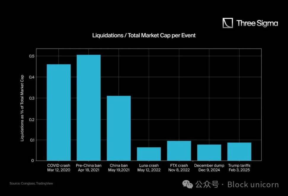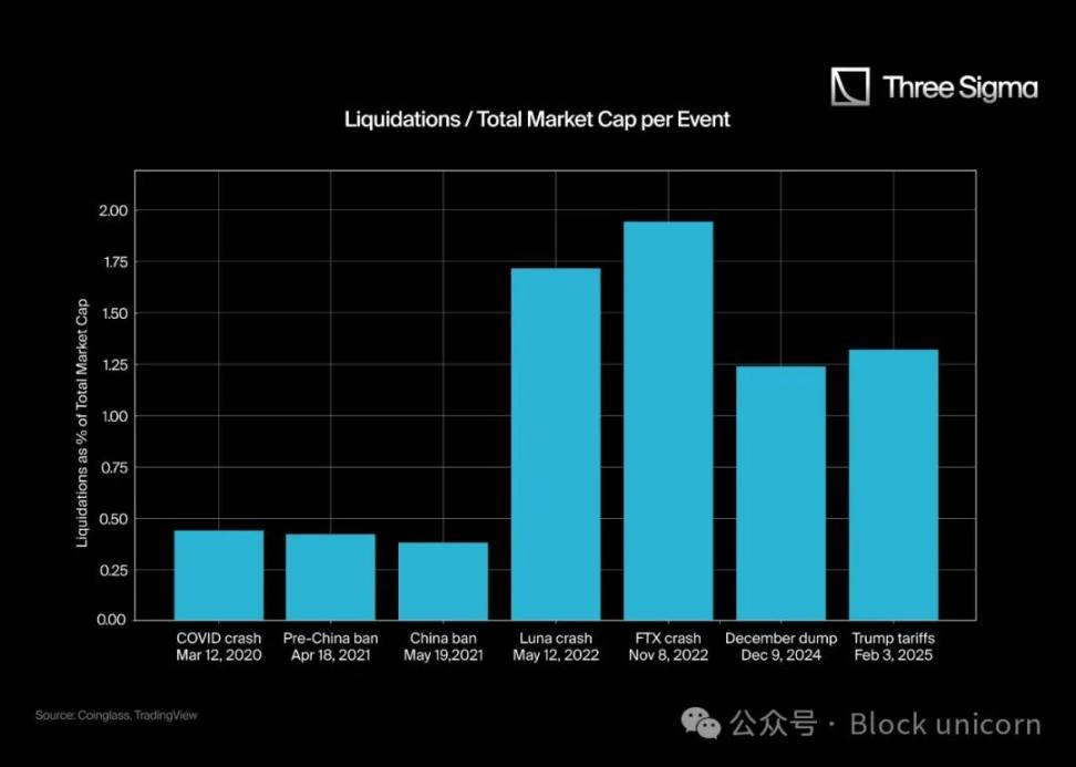 为了提供更多背景信息,我们将这些事件的总“真实”清算与当时的市场总市值进行了比较。比率计算公式为:(清算 / 市场总市值)× 100: