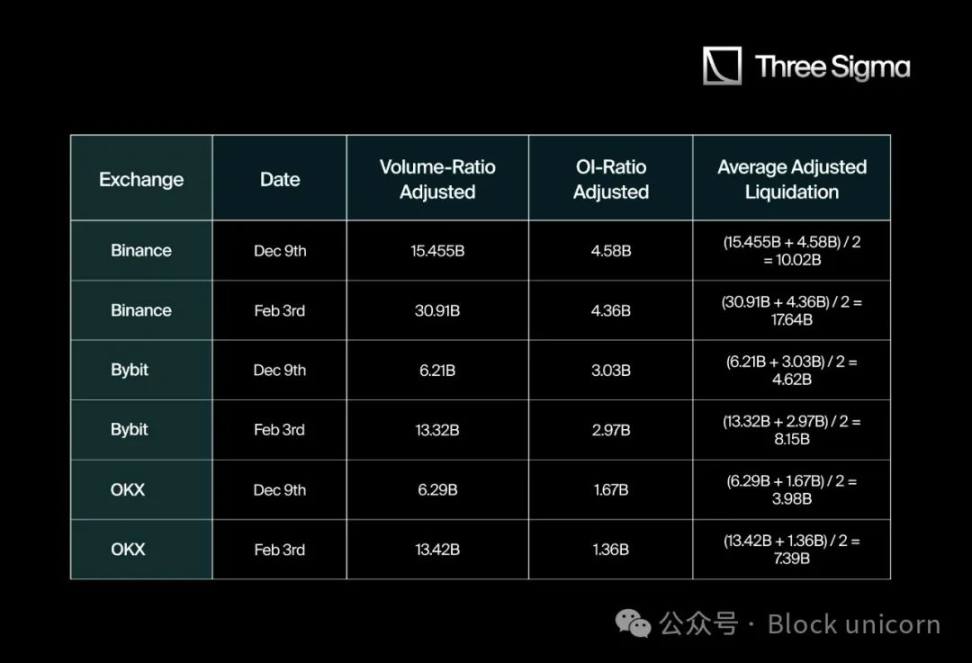 为了估算 CEX 的“真实”清算数字,我们以 Hyperliquid 的清算与交易量比率和清算与未平仓合约比率作为基准。然后,我们将它们与 CEX 在两个特定日期(12 月 9 日和 2 月 3 日)报告的值进行比较,得出了一个调整因子。