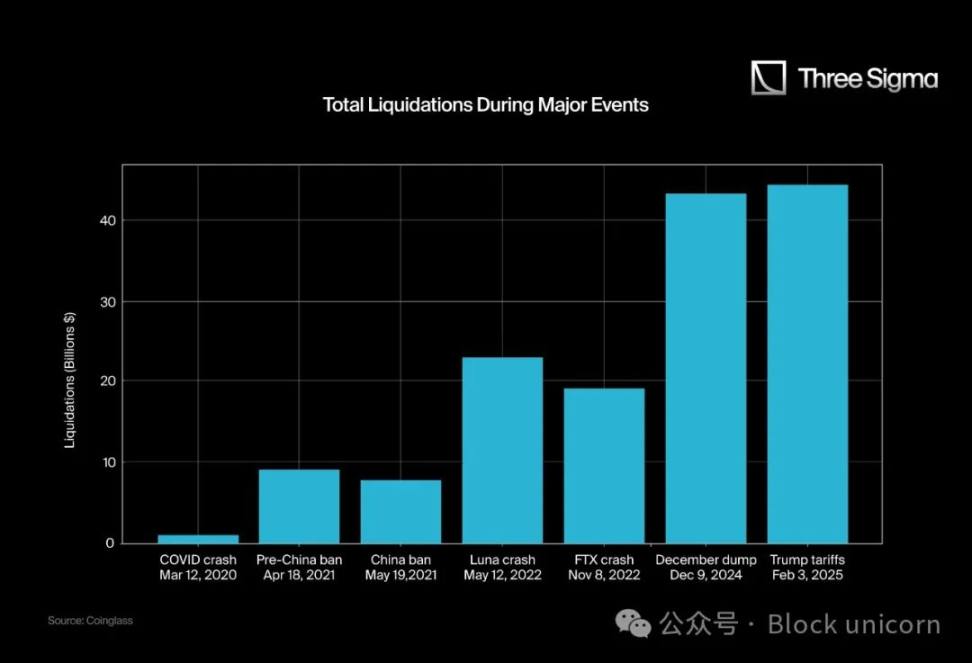 这种对比在考虑历史事件时尤为显著:2020 年 COVID 崩盘虽然在其时代规模较大,但现在显得相对较小,正是因为当时很少有参与者高度杠杆化。随着杠杆变得越来越普遍,清算的绝对和相对规模都在增长,但官方数据流的限制可能会让交易者和分析师对系统性风险产生扭曲的看法。