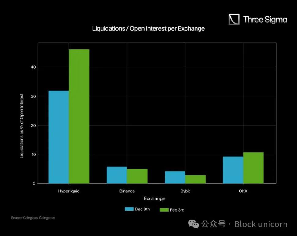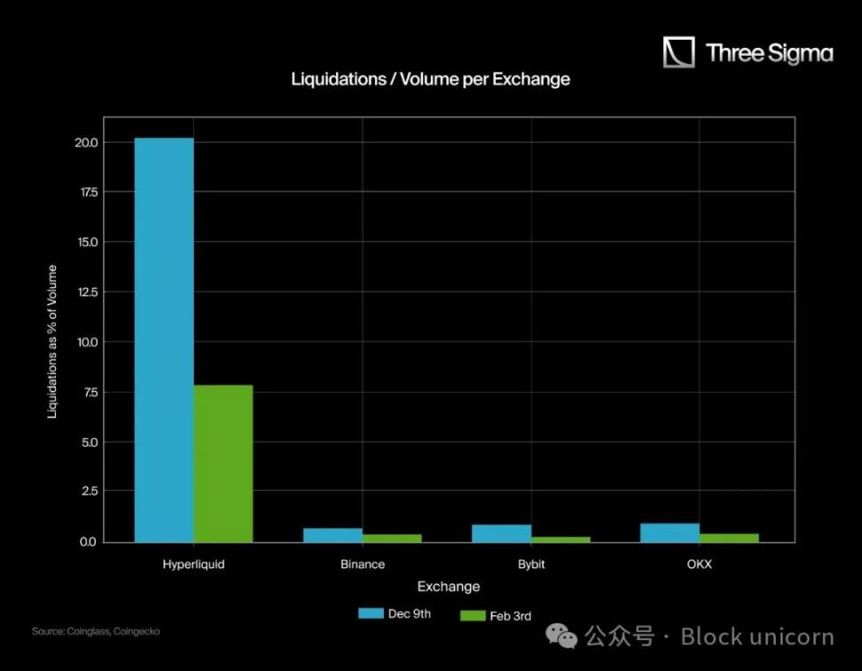 在将 Hyperliquid 的清算数据与主要 CEX 报告的有限数字进行比较后,我们发现了一个显著的差异。为了量化这一点,我们收集了 12 月 9 日和 2 月 3 日 Binance、Bybit 和 OKX 的数据,特别分析了它们报告的清算与交易量和清算与未平仓合约比率。