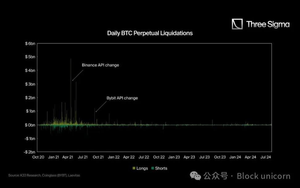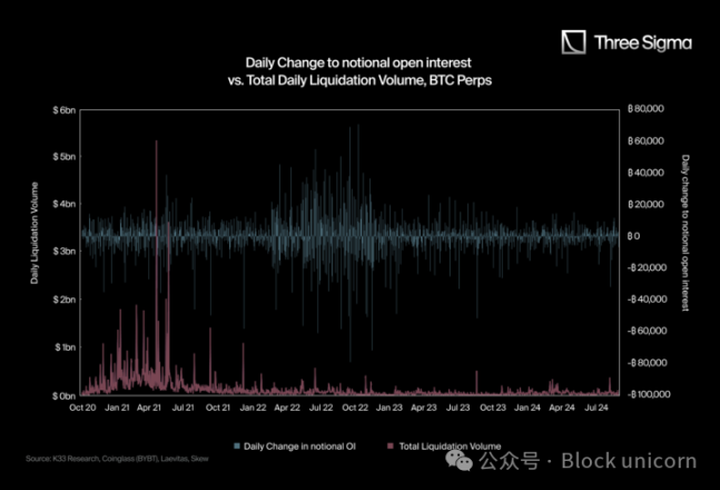 在第二张图表中,他们将总清算量与名义未平仓合约的每日变化进行了比较。名义未平仓合约的每日大变化通常会导致大清算,但正如我们在图表中看到的,2021 年第二季度后,在未平仓合约波动大的日子里,没有大的清算峰值。