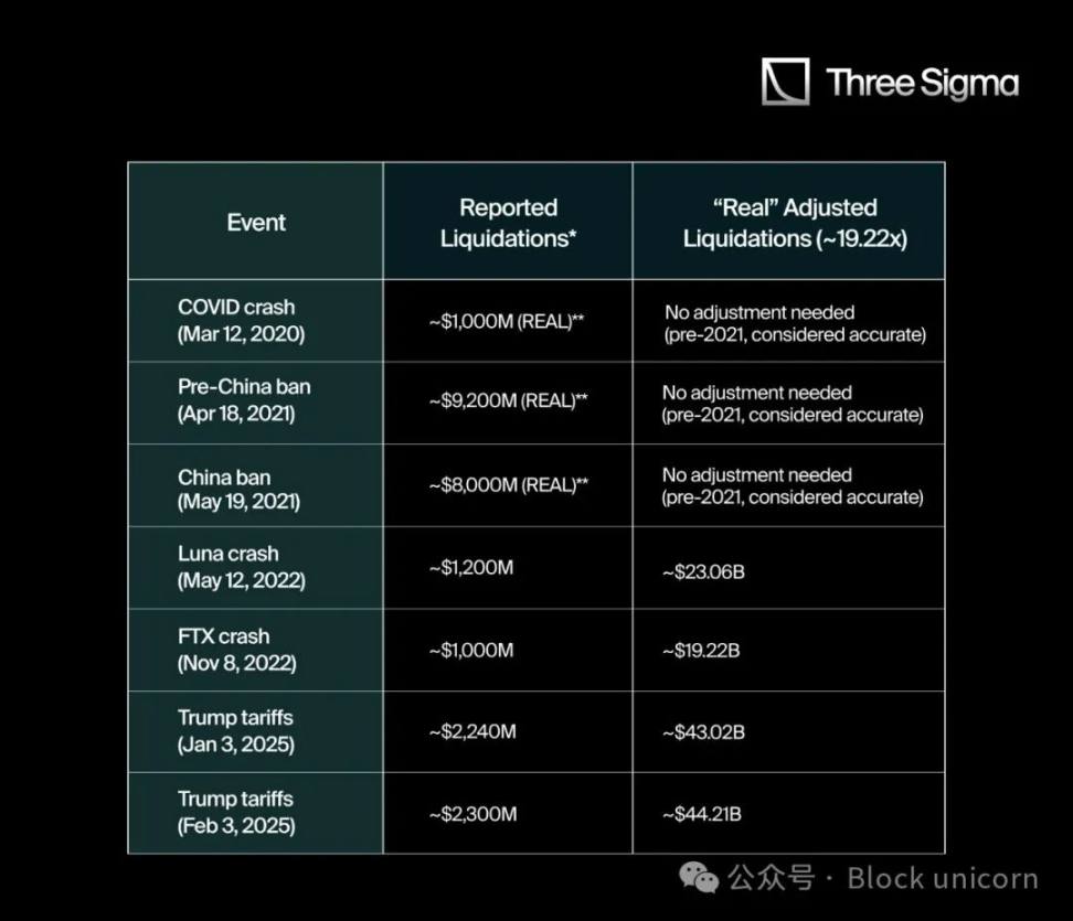 有了这个 19.22 倍的乘数,我们分析了一些加密货币历史上最重要的清算事件,以估算如果它们像 Hyperliquid 一样透明报告,其真实清算数字可能会是多少。下表将通常引用的清算金额与使用修正后的 19.22 倍乘数调整后的值进行了比较: