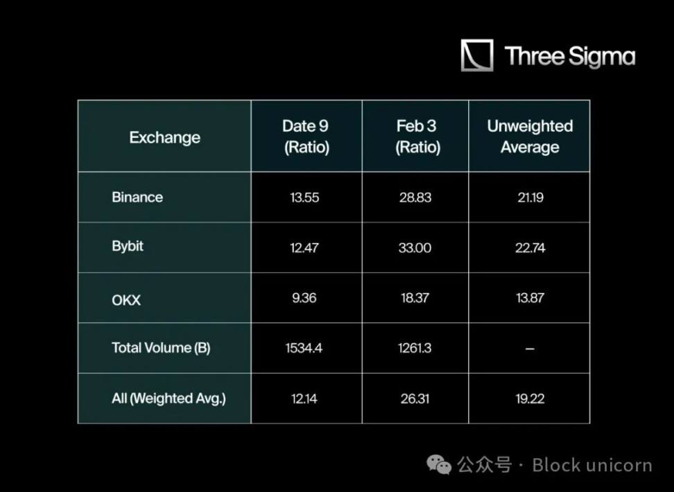 当我们首次计算交易所特定的乘数(Binance:21.19,Bybit:22.74,OKX:13.87)时,简单平均值表明全球乘数为 19.27 倍。然而,在调整了交易所之间的交易量加权差异后,更准确的加权平均值达到了 19.22 倍。