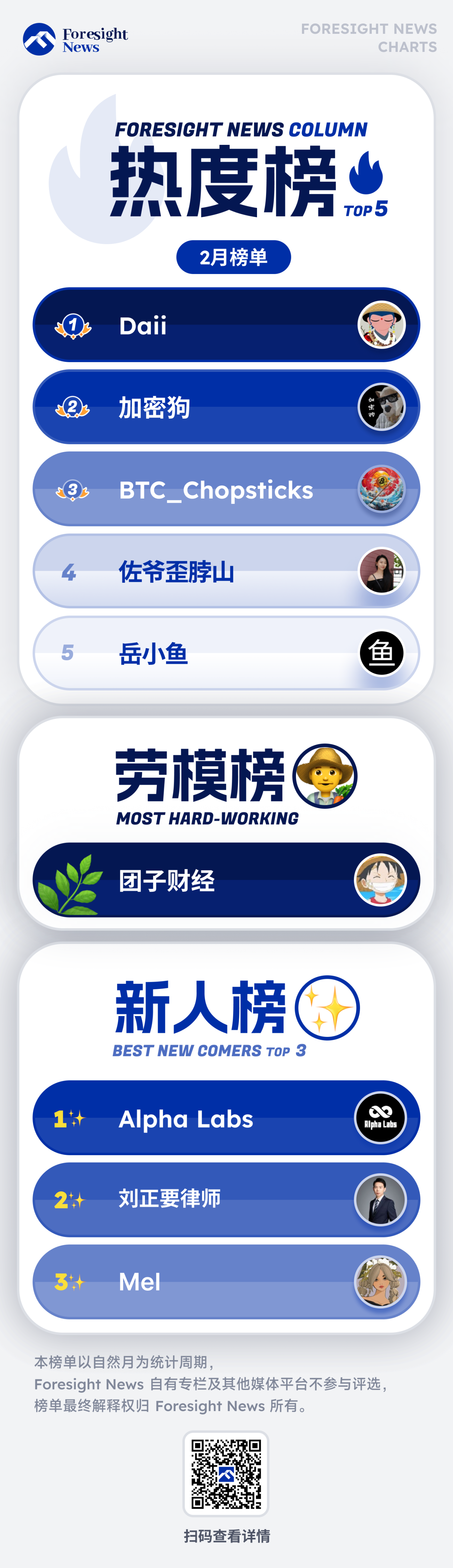 Foresight News 根据 2025 年 2 月份专栏作者文章阅读量、内容质量、发文数量等数据,综合评定出当月热度榜 Top5、劳模榜 Top1 及新人榜 Top3,并附上其专栏下优秀文章推荐: