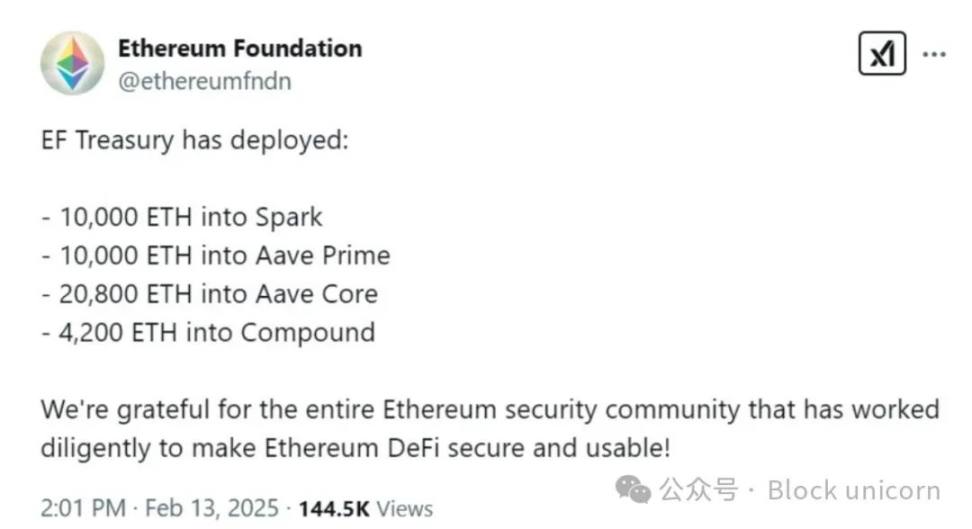 2 月 13 日,以太坊基金会向 Aave、Compound 和 Spark 去中心化金融协议存入了 45,000 ETH,当时价值约 1.2 亿美元,以赚取收益。