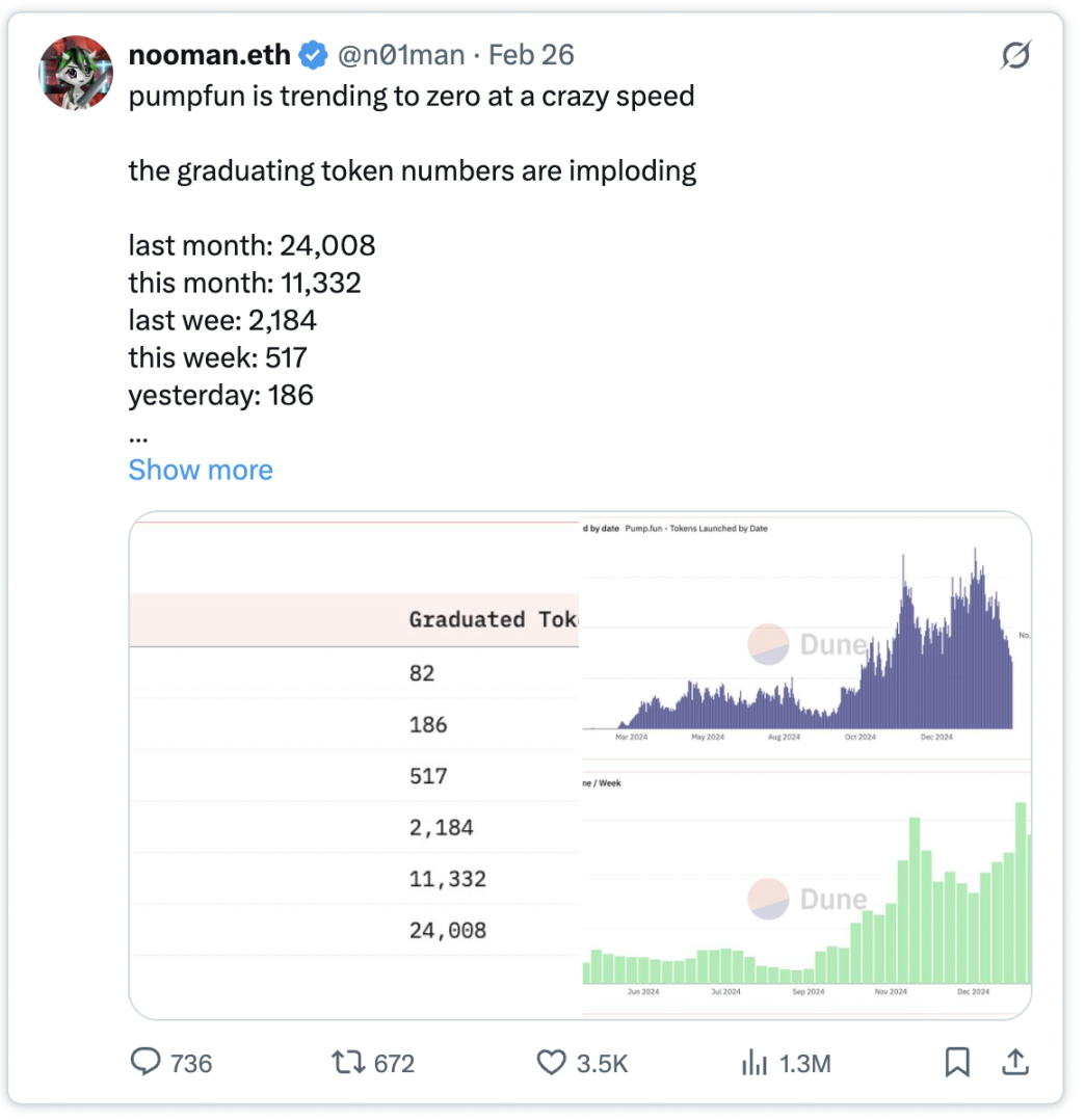 Pump.fun 上新 Memecoin 的发行和毕业数量正在大幅下降