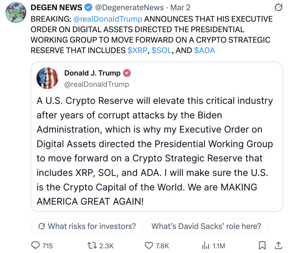 特朗普宣布他关于数字资产的行政命令指示总统工作组推进一项加密货币战略储备计划,其中包括 XRP、SOL 和 ADA