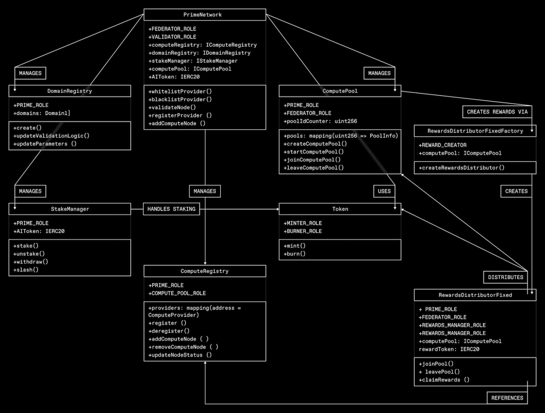 Prime Intellect 智能合约目前部署在 Base Sepolia 测试网上,不过,Prime Intellect 计划在之后迁移到自己的链上。Prime Intellect 的合约组件 RewardsDistributor 中还描述,可根据算力池中的活跃时间计算节点的奖励,并相应地分配代币。