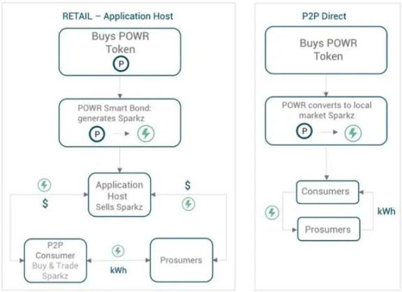 Power Ledger 采用双重 Token 体系,一个是 POWR,为平台准入 Token,一个是 Sparkz,为当地市场锚定货币(可支持各区域)用于托管 POWER,类似于智能债券,是由在平台上运行某个应用程序的实体和公司开发,用于在全球不同的市场中代表电力单位的标记值。Sparkz 可由 Power 兑换,也可兑换当地法币。