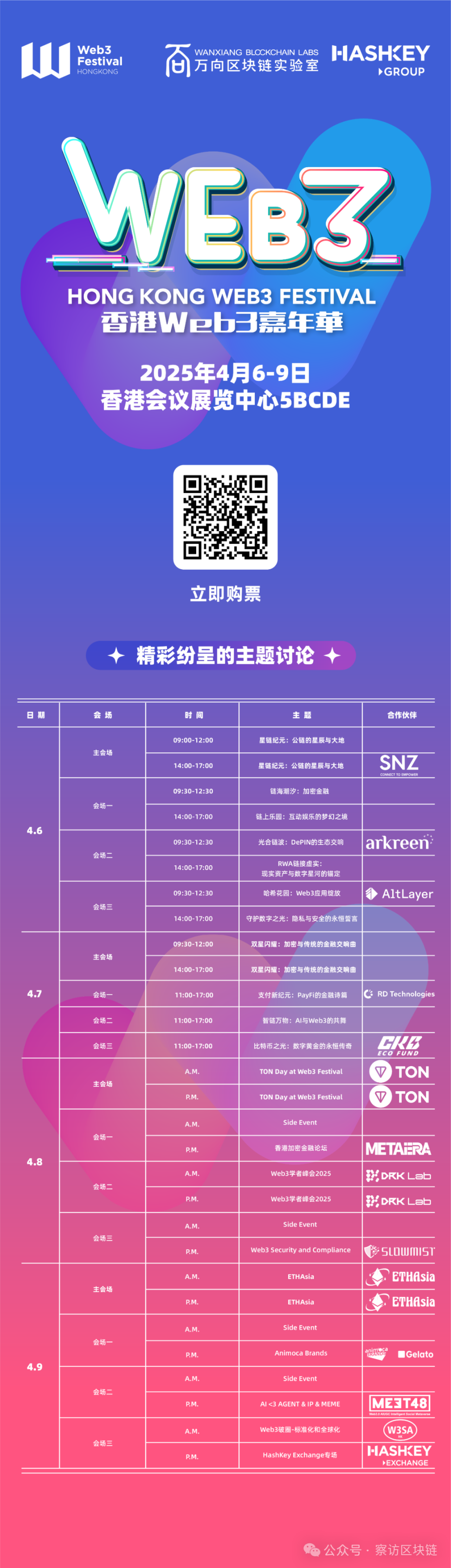 更有国风四重奏、捏面人、筷子雕刻、扇面书法、人物漫画等体验等你来解锁!还在等什么,40+ 场主题论坛,400+ 位演讲嘉宾,200+ 明星 Web3 项目,这样的 Web3 狂欢,错过等一年!赶快识别二维码,前往活动官网购票参会吧!输入神奇密码(CFBLOCKCHAIN)更可享 85 折特惠!赶快识别上方二维码购票参会吧,(进参会群加阿布 VX:CF_Blockchain)