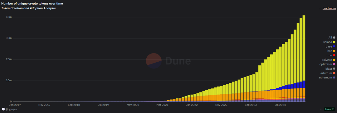 在 2023 年 12 月,Solana 网络 Token 资产种类数量首次超过 1,000 万种,花费了超过 3 年的时间;伴随着 pump fun 全新的资产发行方式,在 2024 年全年,Solana 网络上就一共发射了超过 1,300 万种 Token。换算至每日计算,每天在 Solana 网络上发射的 Token 就超过了 3.6 万种,资产发行大幅膨胀。