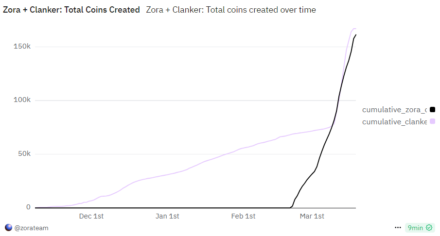 尽管才诞生不到 1 个月,通过 Zora 启动 Token 数量已经逼近存在时间数月之久的 Clanker。Zora 的核心在于创建帖子,每个帖子自动生成一个在 Base 网络上可交易的 ERC-20 Token,总供应量固定为 10 亿,创作者初始获得 1,000 万 Token(1%),流动性自动部署为 Uniswap 1% Fee Pool。此外,用户在 Zora 上的交易还需要收取 1% 的交易费用。