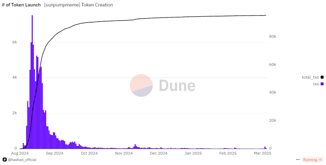 SunPump 是一个构建在由 Justin Sun 团队支持的 Tron 网络的 Memecoin Launchpad,与 pump fun 和 Four Meme 类似。SunPump 曾一度帮助 Tron 网络在 2024 年 8 月捕获了超过 6,000 万美元月度费用,为历史次高水平;现累积在 Tron 网络上创建了超过 9.5 万种 Token。