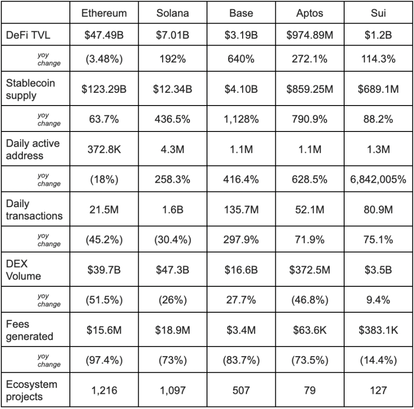The lack of a sustainable narrative in this cycle has limited yield opportunities for retail users. Meme coins, often associated with sentimental value and community attention, have been the biggest beneficiaries as retail users pivot their attention to this subsector. Networks like Solana and Base offer higher performance than Ethereum, thus making them ideal for developing large-scale consumer applications.
