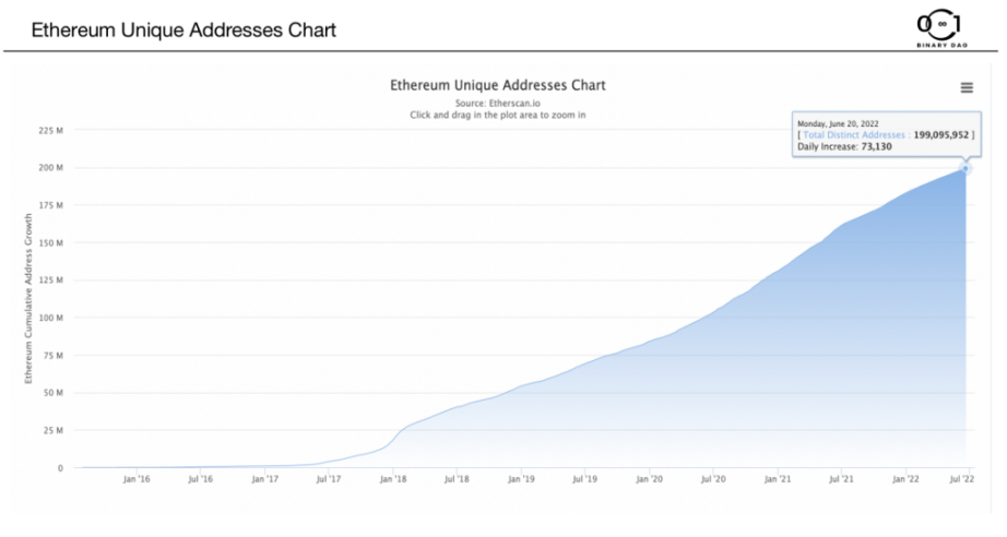 彼时以太坊钱包的实际地址数刚过百万,而DEFI的生态正是在以太坊发生并且逐步成长的,根据ETH的地址数增长趋势图可以看出2018年之后整个区块链产业的链上运动浩浩荡荡,一往无前。