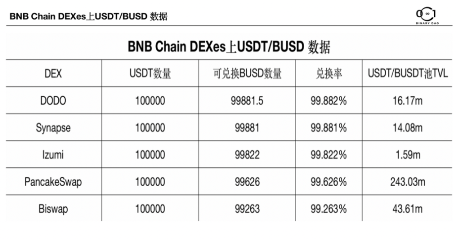 我们以10W枚USDT在BNB Chain上兑换BUSD为例,发现Pancake的表现真的很差,兑换比率只有99.626%,在统计范围里只能排到第四,DODO和Synapse兑换率不相上下,值得注意的是Izumi的TVL只有1.59m,但其对10W枚USDT的报价竟然远好过Pancake,如果Izumi能够捕获10m以上的TVL,其报价表现很有可能好于DODO。
