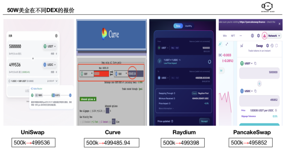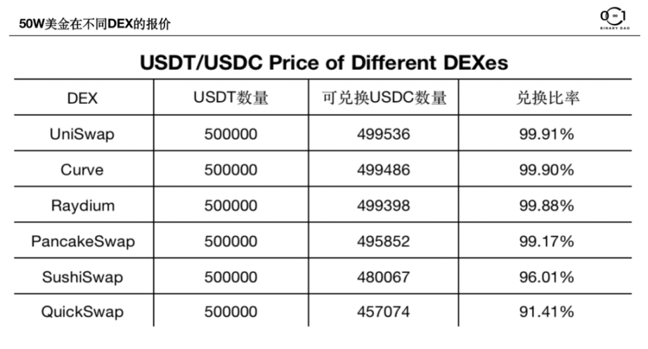 我们以50W枚USDT交易需求在市场不同DEX报价,发现各个平台可兑换的USDC差异额非常大。