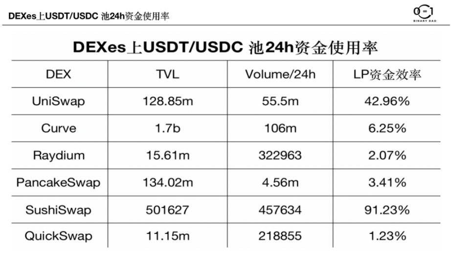 接下来,我们就要再来对比一下各个DEX平台所有LP资金的TVL和资金使用效率。