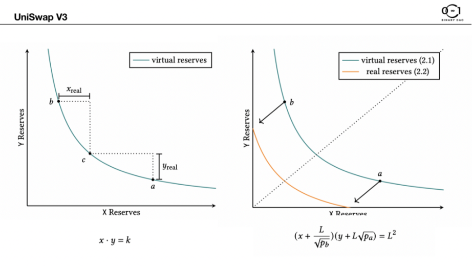 在UniSwap V3出来之前,90%的DEX都是V2的仿盘,典型代表如Sushi,pancake和quickswap,以0.3%的手续费,把资金平铺在X*Y=K的曲线上,V3做了三点改良: