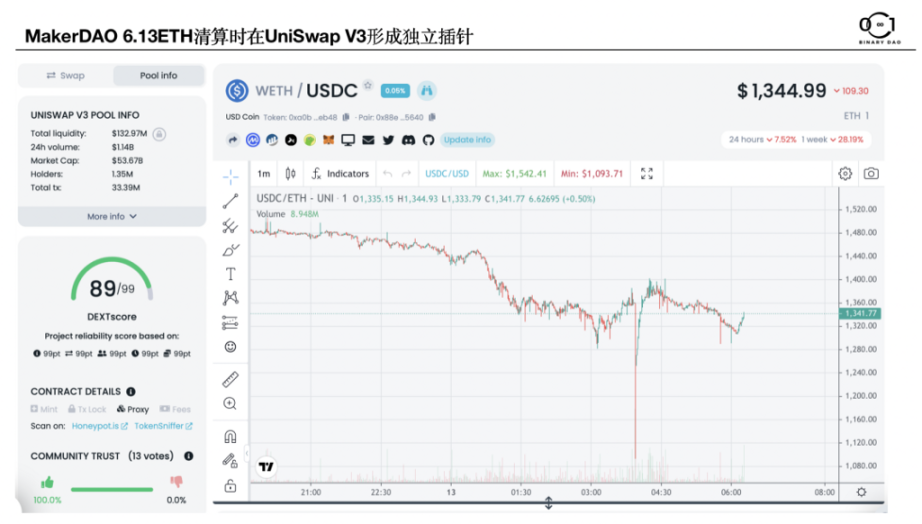 再比如Uni V3,将大量的资金迁移到频繁交易区间,一旦出现快速下跌或快速上涨的极端行情,就很容易出现插针的情况,6月13日ETH下跌触发了MakerDAO上6.5亿美金的清算,就导致了Uni V3的独立插针。