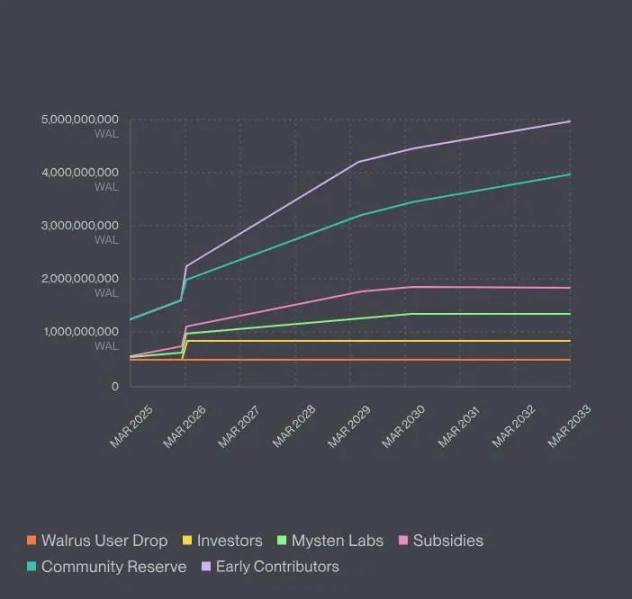 - 10% 用于 Mysten Labs 分配:主网上线时解锁 5000 万 WAL,剩下部分将以线性解锁方式持续释放至 2030 年 3 月。