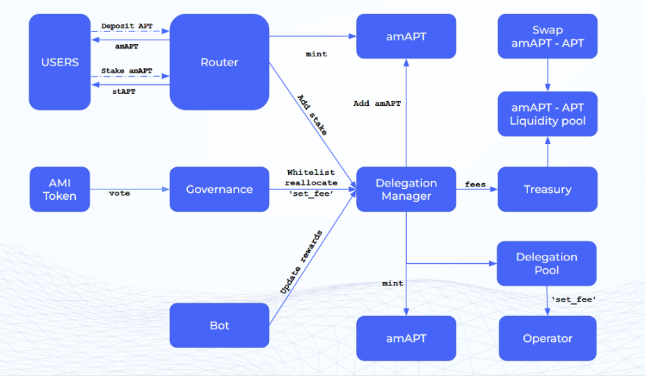 Amnis Finance 允许用户在 APT 持仓上赚取质押奖励,而无需锁定资金或维护验证者节点。Amnis 协议由多个核心组件组成: