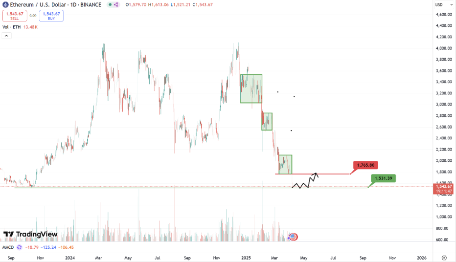 截至本周一,BTC 在上周艰难企稳于 8 万美元上方后再度受全球关税反制政策影响在今晨迅速跌破 8 万美元关口,现暂时止跌于本年度低点 76600 美元附近,从短线释放的卖盘成交量上看,本次瀑布行情抛售强度要远强于形成三月低点的时期,因此本周关注重点就是三个点位,当前的 76600 美元一线支撑,若持续下探是缩量下跌且不能有效跌破该点位,那么形成 W 底开启反弹的概率偏高。反之若基本面继续恶化跌破一线支撑则关注 74000 美元(24 年箱体顶部)的二线支撑,该区域同样有概率成为下一轮涨势的起点,至于反弹的第一大有效阻力仍可直接看至 89000 美元附近,只有有效突破该阻力,长期涨势才有望开启,否则仍有概率走出一段宽幅震荡行情。