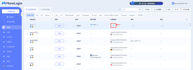 在左侧导航面板中,点击「环境」>「浏览器环境」,找到需要设置代理的环境点击「编辑代理」。