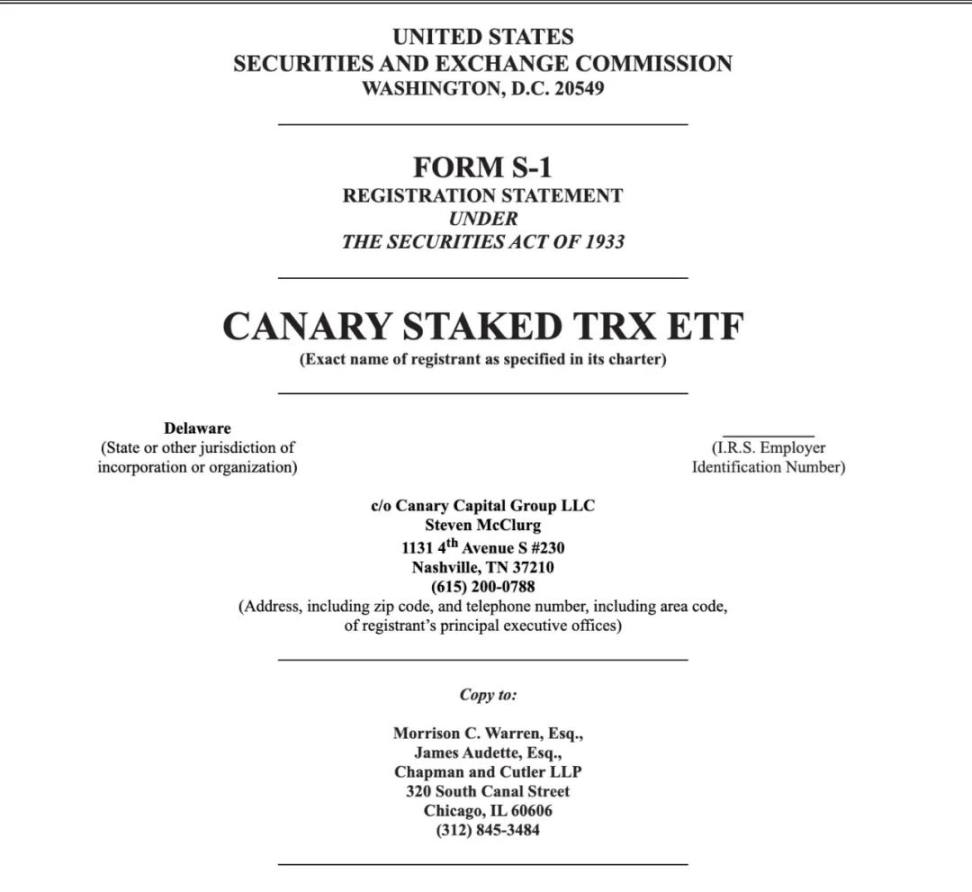 2025 年,美国证券交易委员会(SEC)正式受理Canary Capital提交的现货 TRX ETF 申请——这是全球首个以华人公链为底层资产的 ETF 提案。