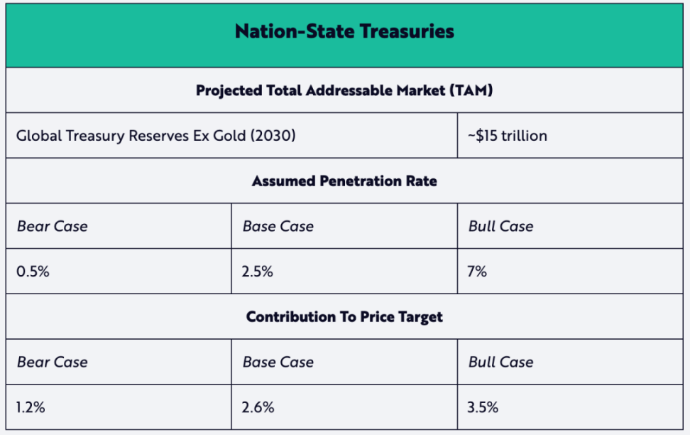 如上图所示,“数字黄金”对我们的熊市情景和基准情景贡献最大,而机构投资对我们的牛市情景贡献最大。有趣的是,国家国库、企业财库以及比特币链上金融服务在每种情景中的贡献都相对较小。 在下表中,我们详细列出了我们预测的六种资本累积来源分别对熊市、基准市场和牛市情况的相对贡献: